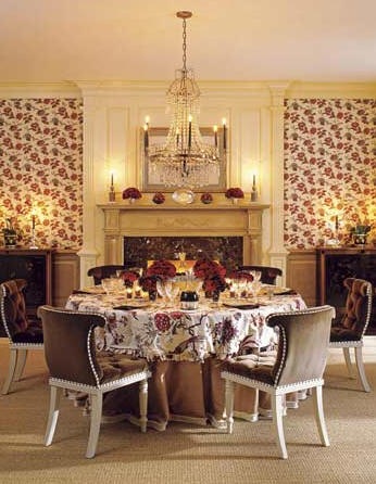 A traditional dining room with a traditional chandelier. The choice of fabric on the walls and the chairs give this room its special look.